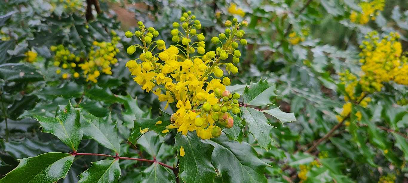 Oregon Grape (Mahonia aquifolium) is a evergreen shrub native to the Pacific Northwest coastal regions. These versatile shrubs are identified by its green stiff leaves that resemble leaves of a holly bush. The plant flowers in late winter/early spring with showy yellow flowers. The roots and stems of the plants are also yellow when cut. The shrub produces purple blue fruits that resemble clusters of grapes. This shrub is a great resource for both people and wildlife. The shrub is used by humans as a food source and natural dye. The shrub also provide great resources for wildlife.